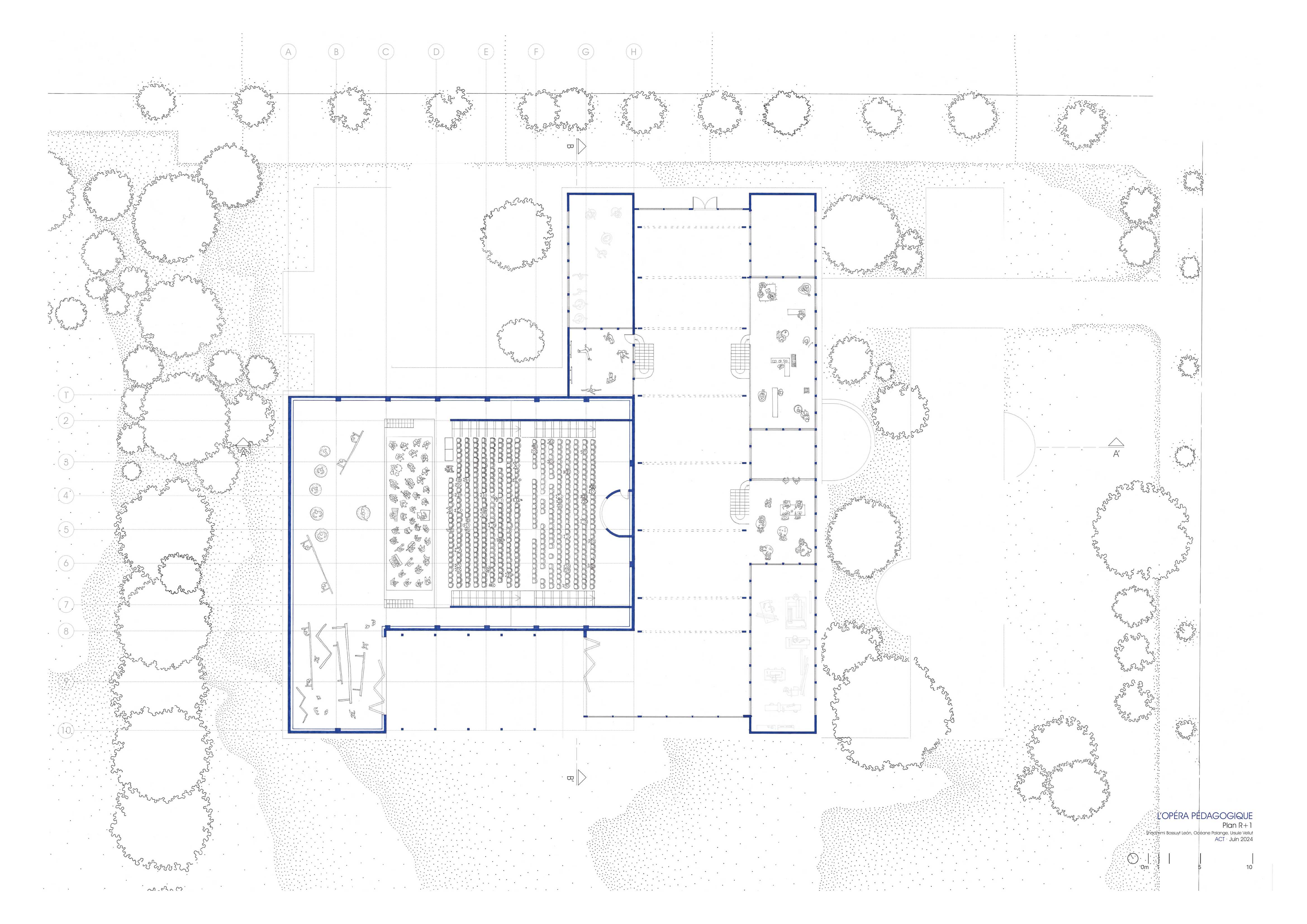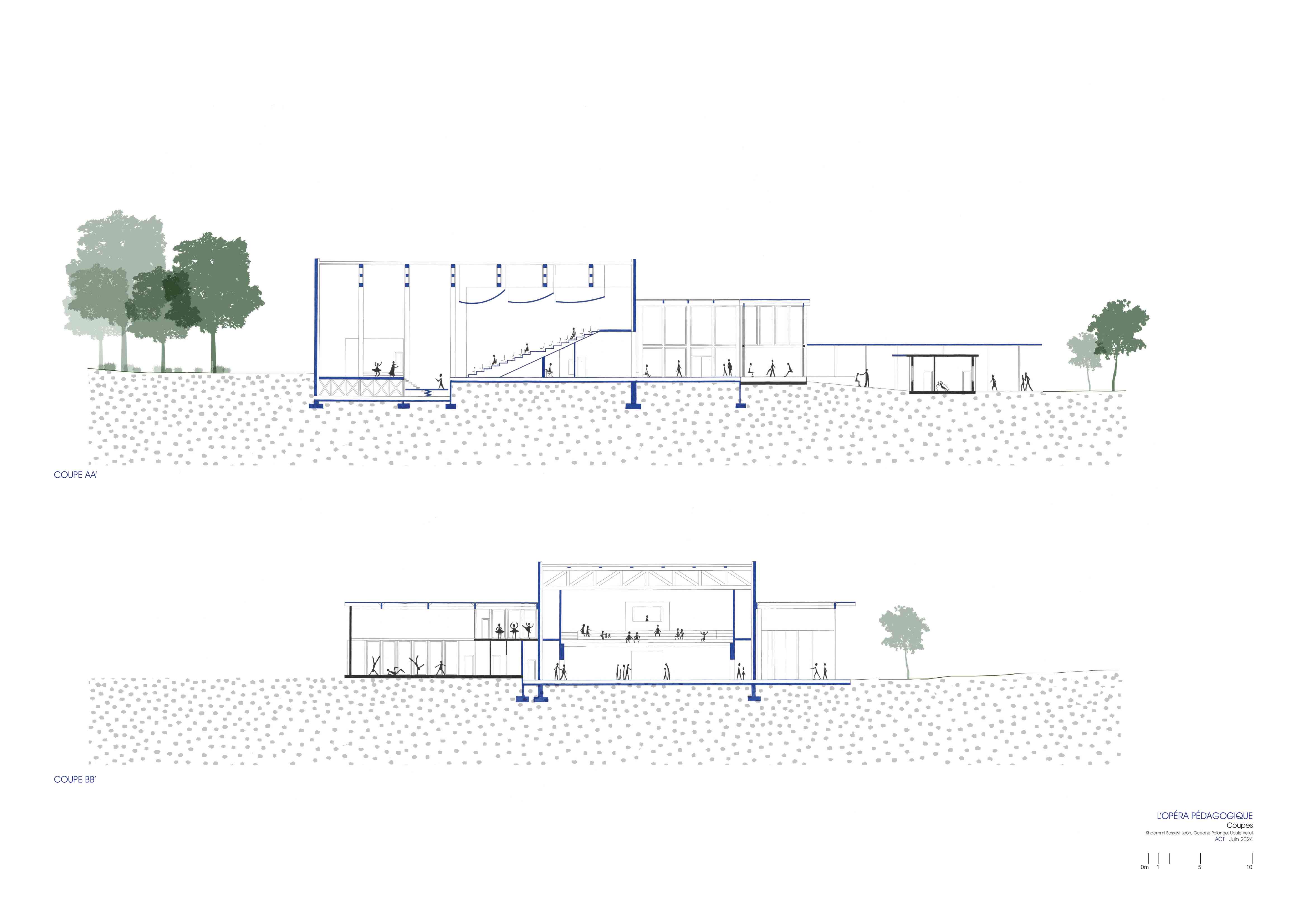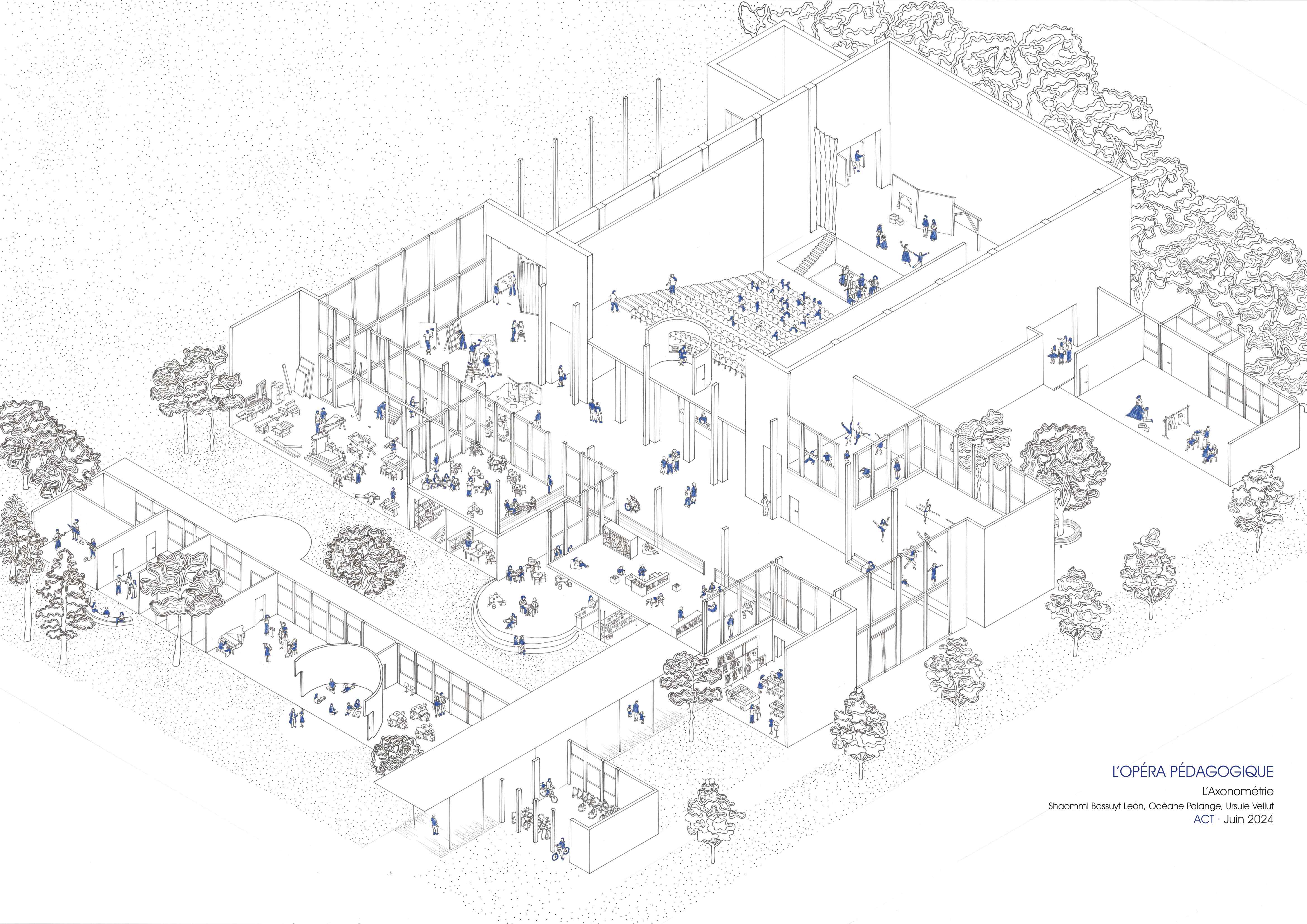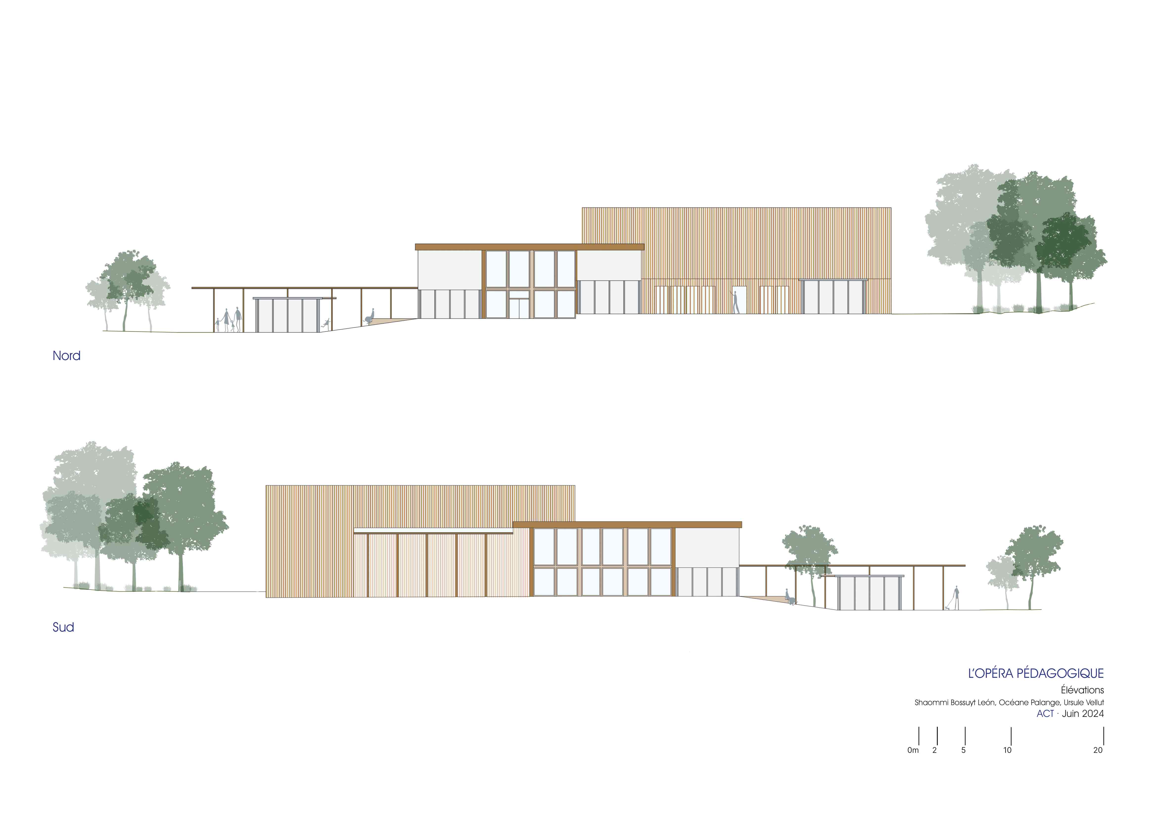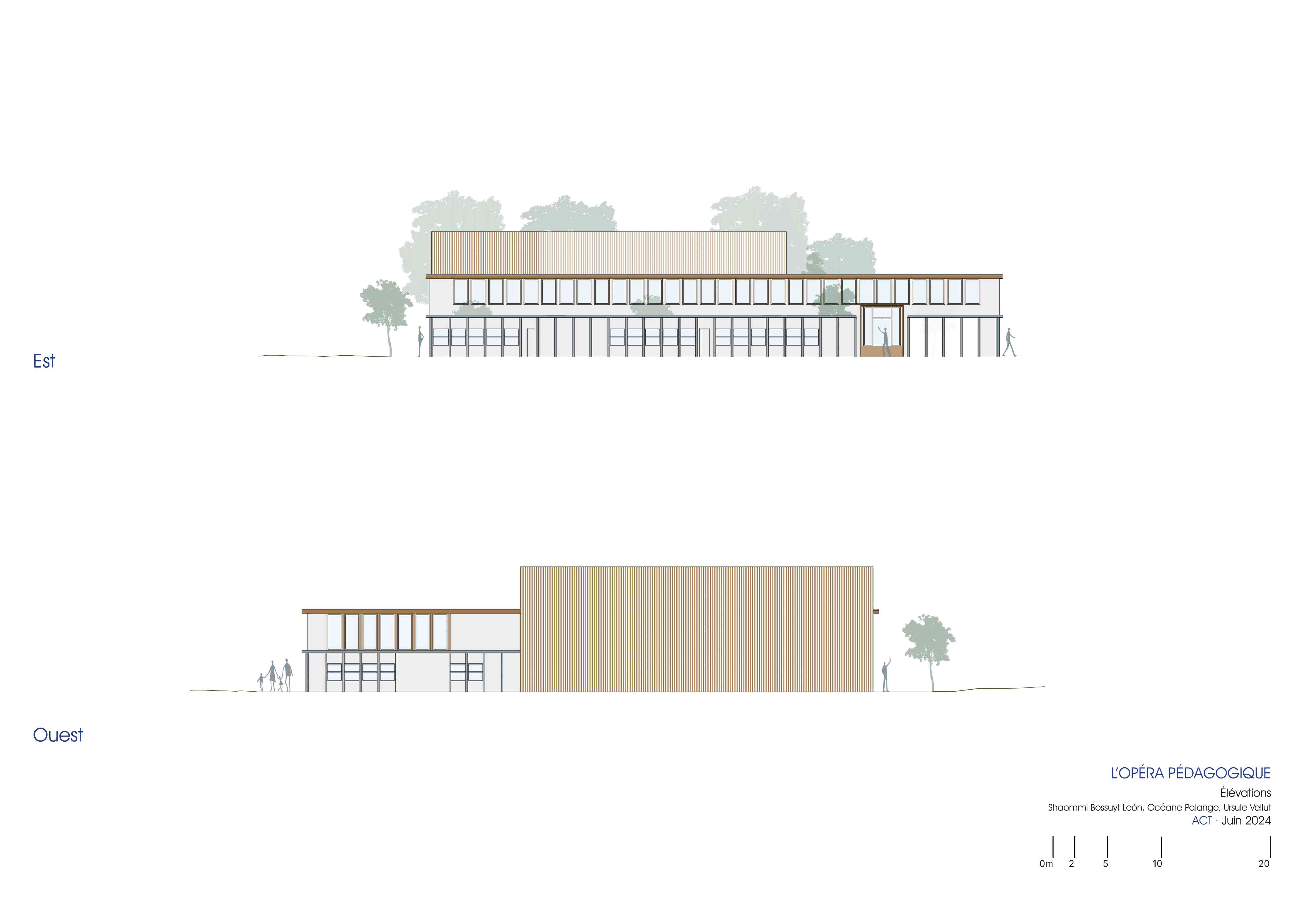 Notre projet se concentre sur la transformation de l’ancien site de la « Steinerschool Brussel » en un opéra pédagogique. L'objectif est de créer une école de l'opéra offrant une éducation complète dans les domaines de l’opéra, de la musique, de la danse et du théâtre. Le projet se divise en trois parties distinctes mais complémentaires. La première partie est consacrée à l’apprentissage théorique, avec des salles de classe et des espaces extérieurs couverts, permettant aux étudiants de s’immerger dans la théorie musicale et artistique tout en restant en contact avec la nature. La deuxième partie du projet est la halle de production, qui s'étend au-dessus des deux conteneurs centraux. Cet espace en double hauteur est le cœur du projet, offrant un lieu pour la création de décors d’opéra, visible par le public, tout en intégrant discrètement les conteneurs. Des ateliers de création, des salles de répétition et une cafétéria y sont également intégrés, offrant un environnement dynamique où les visiteurs peuvent observer et même participer au processus créatif. Enfin, la troisième partie du projet abrite la salle de spectacle et ses coulisses. Située à l’étage supérieur et accessible après avoir traversé la halle, cette salle de spectacle est dissimulée derrière un bardage en bois. Elle comprend un gradin pour le public, une fosse pour l’orchestre, ainsi qu’une grande scène, créant une expérience immersive où les visiteurs découvrent d'abord les coulisses de l'opéra avant d'entrer dans l'univers du spectacle lui-même. Cette structure vise non seulement à enseigner les arts de la scène, mais aussi à offrir aux visiteurs une immersion complète dans le processus de création artistique, en les engageant de manière active et participative dans chaque étape du parcours, de l'apprentissage à la représentation finale.