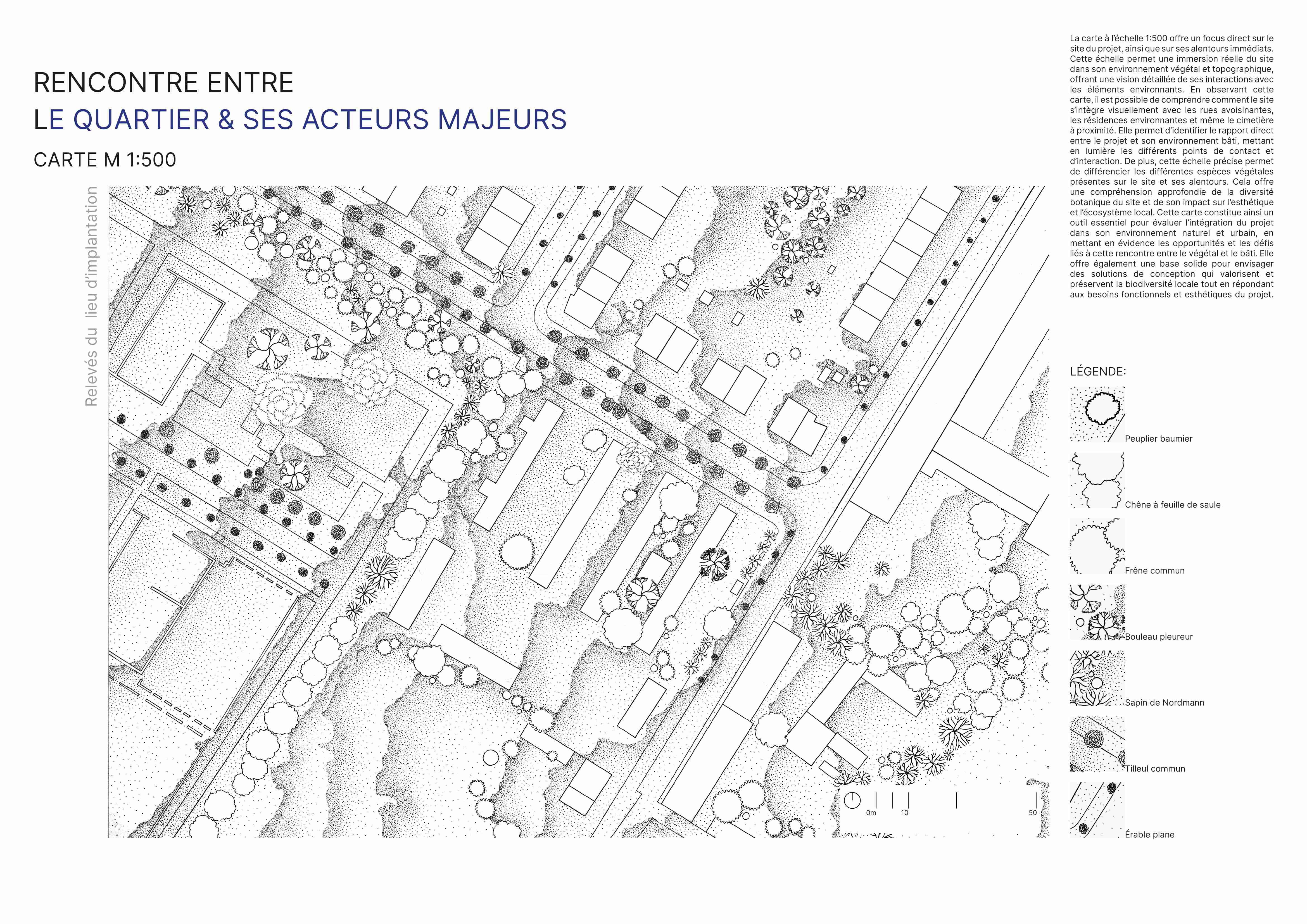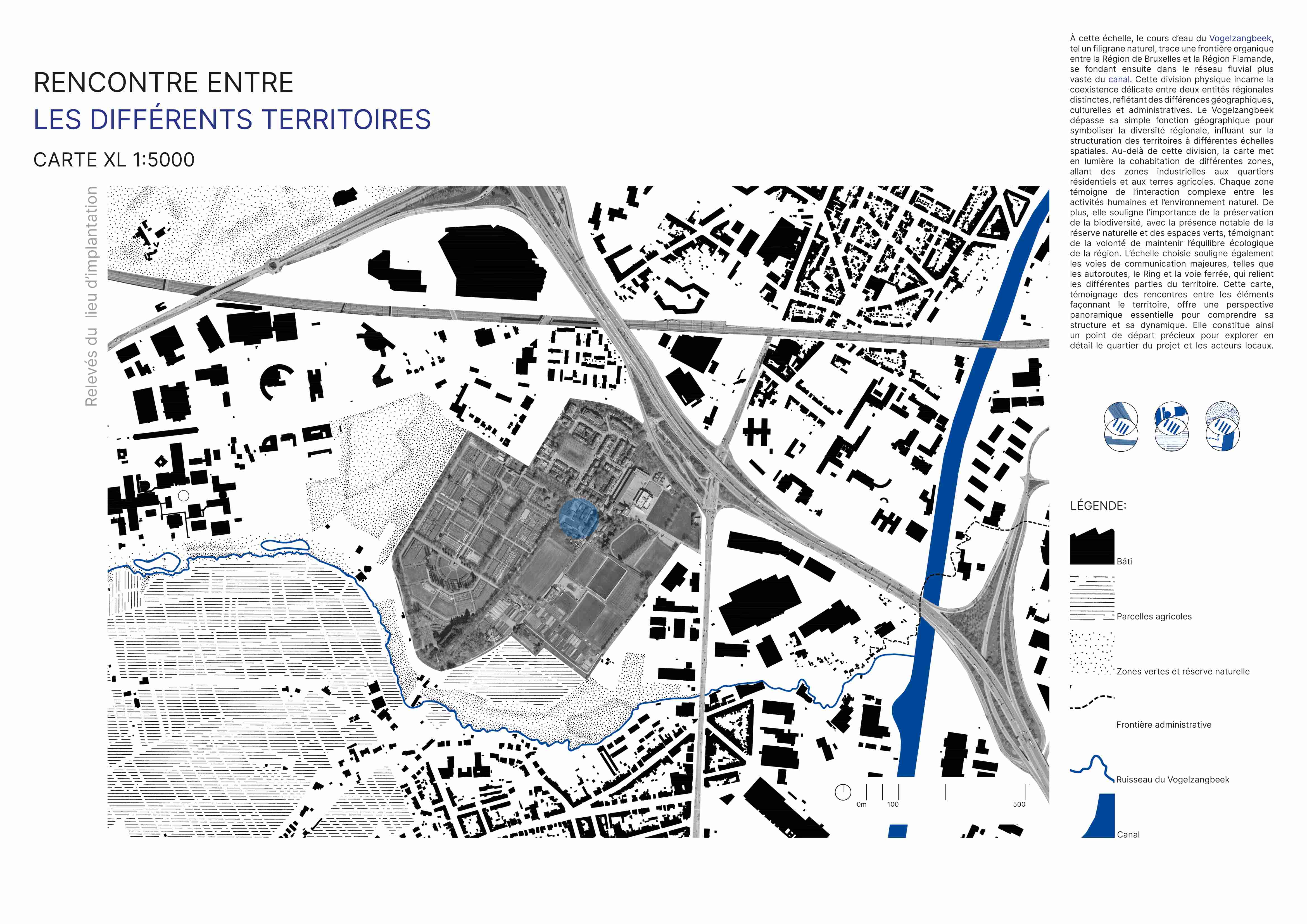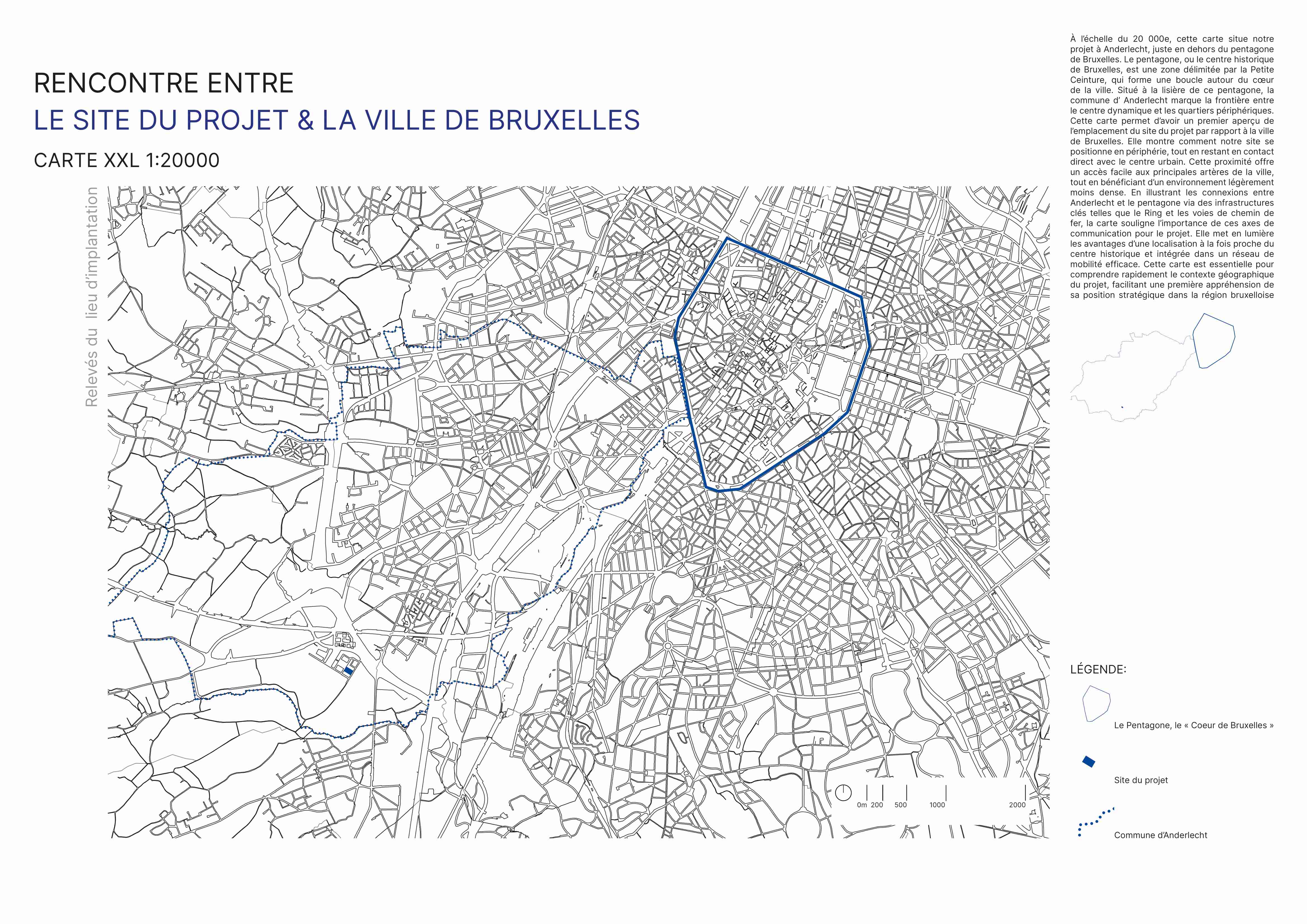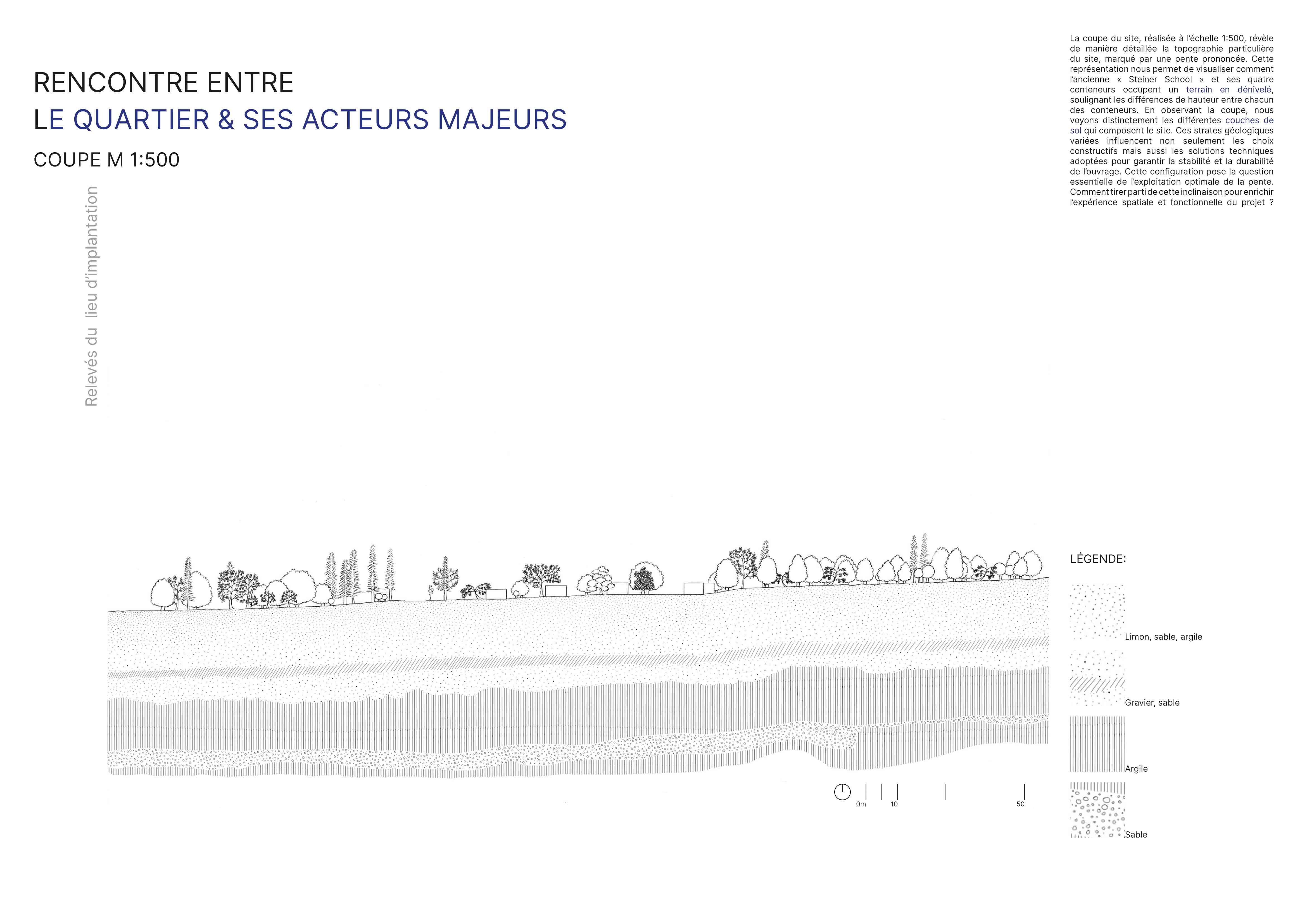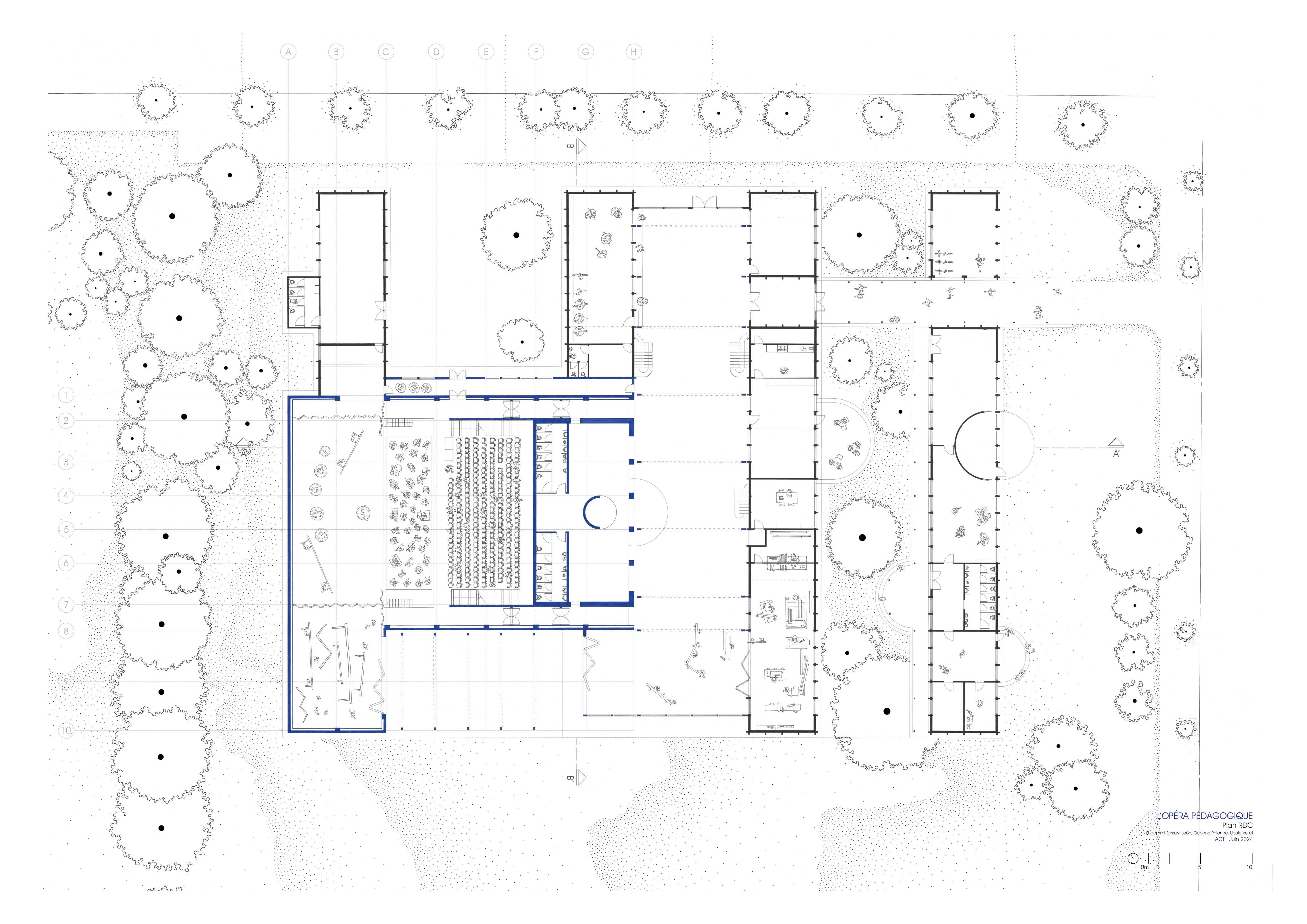 Notre projet se concentre sur la transformation de l’ancien site de la « Steinerschool Brussel » en un opéra pédagogique. L'objectif est de créer une école de l'opéra offrant une éducation complète dans les domaines de l’opéra, de la musique, de la danse et du théâtre. Le projet se divise en trois parties distinctes mais complémentaires. La première partie est consacrée à l’apprentissage théorique, avec des salles de classe et des espaces extérieurs couverts, permettant aux étudiants de s’immerger dans la théorie musicale et artistique tout en restant en contact avec la nature. La deuxième partie du projet est la halle de production, qui s'étend au-dessus des deux conteneurs centraux. Cet espace en double hauteur est le cœur du projet, offrant un lieu pour la création de décors d’opéra, visible par le public, tout en intégrant discrètement les conteneurs. Des ateliers de création, des salles de répétition et une cafétéria y sont également intégrés, offrant un environnement dynamique où les visiteurs peuvent observer et même participer au processus créatif. Enfin, la troisième partie du projet abrite la salle de spectacle et ses coulisses. Située à l’étage supérieur et accessible après avoir traversé la halle, cette salle de spectacle est dissimulée derrière un bardage en bois. Elle comprend un gradin pour le public, une fosse pour l’orchestre, ainsi qu’une grande scène, créant une expérience immersive où les visiteurs découvrent d'abord les coulisses de l'opéra avant d'entrer dans l'univers du spectacle lui-même. Cette structure vise non seulement à enseigner les arts de la scène, mais aussi à offrir aux visiteurs une immersion complète dans le processus de création artistique, en les engageant de manière active et participative dans chaque étape du parcours, de l'apprentissage à la représentation finale.