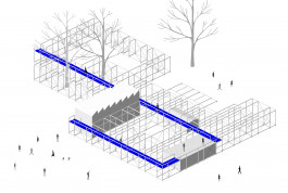 Cette architecture temporaire se base sur une trame constituée de trois types de modules qui composent une enveloppe visuellement légère de piliers métalliques reliés entre eux par des poutres et des câbles. Dans cette enveloppe viennent se placer les éléments du programme : la serre, le patio, le poulailler, le stockage et la cuisine. Ils s’intègrent par leur transparence ou leur translucidité mais se distinguent par leur hauteur. La structure poteaux-poutres permet l’intégration de deux passerelles au R+1 pour créer des connections entres les différents usages.