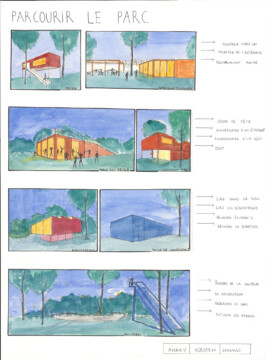 Avec ses bâtiments, l’usager est amené à parcourir le parc, à se laisser surprendre par l’architecture et les couleurs, les étudiants peuvent manger au restaurant le midi, les résidents alentours peuvent se retrouver dans la salle de fête, la salle de conférence peut accueillir les intervenants de l’université, le promeneur solitaire peut monter les marches du belvédère et admirer la vue, emprunter un livre à la bibliothèque et se plonger dedans en intérieur ou s'il fait beau en extérieur. L’architecture s’éveille au rythme des usages.