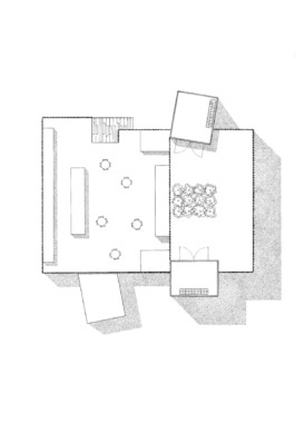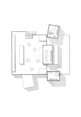 Un escalier, imaginé comme un module à part entière, introduit une variation de hauteurs qui crée une hiérarchie spatiale. L’espace ouvert au public, au rez-de-chaussée, s'étend sur une terrasse au premier étage. Tandis que les logements, perchés au deuxième étage, offrent un espace plus intime, propice aux rencontres. Des connexions visuelles entre les différents niveaux assurent la cohésion et favorisent les interactions entre ces divers espaces.