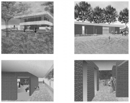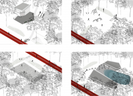Le paysage de la friche est complexe, la densité végétale est variable, parfois infranchissable. Il révèle aussi des clairières qui deviennent des opportunités spatiales. Le programme est alors fragmenté et articulé sur ces espaces qui deviennent des satellites de l’axe de mobilité. Chaque clairière est singulière et présente des qualités topographiques différentes que le projet tend à révéler.