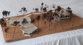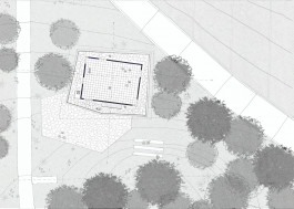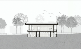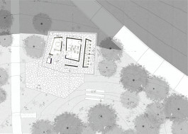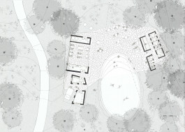 Les fonctions programmatiques d’accueil et de salle communautaire prennent place sur les hauteurs de la parcelle où on retrouve un terrain en pente, pas très dense en végétation. Dans le bas de la parcelle, on trouve, dans un creux de topographie avec une végétation très dense l’espace dédié au bain avec la piscine au centre. Autour, on retrouve d’un côté les vestiaires non-isolés, et de l’autre la cafétéria.