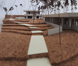Des sols, des blocs de fonctions, des toitures qui ont une identité formelle et matérielle propre, se positionnent dans la topographie pour fabriquer des espaces aux qualités spécifiques. Les formes très géométriques du projet contrastent avec l’organicité de la friche végétale. Les toitures débordantes dont l’épaisseur est volontairement surjouée surplombent les différents blocs de fonctions maçonné, qui sont eux-mêmes détachés des murs de soutènement, ce qui permet de créer d’autres espaces entre intérieur et extérieur, tantôt couvert ou simplement défini par le sol en dalles de pierre bleu.