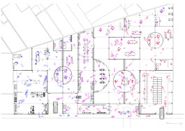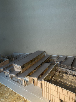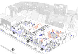 Le projet consiste en une trame structurelle en acier, de 7 mètres par 5 mètres. Cette trame est constituée d’une première colonnade montant jusqu’à 4 mètres de haut, accueillant ensuite une seconde structure, permettant de répondre aux hauteurs d’un atelier de production, mais aussi de se raccrocher aux hauteurs mitoyennes afin de préserver le grain de l’îlot. Cette structure reste flexible. Ensuite, des panneaux en bois viennent déterminer les cloisons ainsi que les ouvertures, permettant de créer une communication entre les différentes industries (ressourcerie, atelier de céramique et centre de tri et réparation de vêtements). Ainsi, la structure et les éléments de cloison sont tous les deux démontables et remontables.