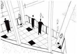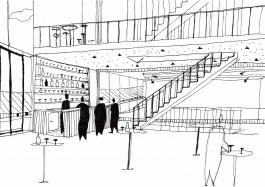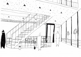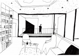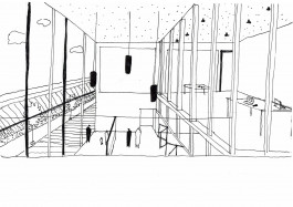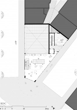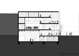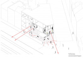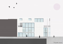 La parcelle se trouve à Forêst, à proximité du Wiels, un centre d’art contemporain. Le programme exige un bâtiment qui permet d’intégrer des espaces accessibles au public, tels que grande salle polyvalente, ateliers, cafétéria, bibliothèque, mais aussi une partie privée consacrée au logement pour les résidents. L’idée générale du projet y répond par des espaces généreux qui donnent chacun leur différence d’ambiances et caractères suivant leur programme et qui présentent tous une double hauteur communiquant entre différents étages et permet d’amener un plus grand apport lumineux et de mettre en valeur chaque espace. Ces jeux de double hauteur constituent cette articulation entre les espaces que ce soit intérieur ou extérieur. De plus, sa composition verticale, donne une certaine importance sur la question de l’angle du bâtiment par son entrée principale, mais aussi par sa terrasse qui se situe aux étages supérieurs donnant une vue vers la petite place des deux intersections de rues. Par cette verticalité, certaines parties du programme comme la cafeteria et la bibliothèque profitent de celle-ci en l’exposant du rdc jusqu’au dernier étage. Ceci permet donc d’avoir une cafeteria avec leurscaractères propres à chaque étage, de même pour la bibliothèque. La circulation est pensée de façon à être simple. Un grand escalier central est envisagé pour la partie publique et un autre escalier, plus discret, est réservé uniquement au logement pour les résidents. Enfin, la façade, qui alterne entre le vitrée et l’opacité permet de crée ce style fin et léger au bâtiment en dosant les deux parties. Les panneaux vitrés sont exposés là où les doubles hauteurs s’affirment, tandis que les panneaux opaques sont placés dans les endroits moins frappants. Cette alternance donne alors une plus grande importance aux doubles hauteurs.