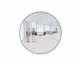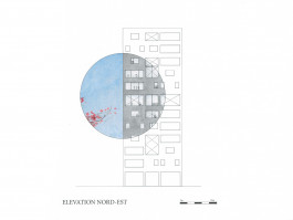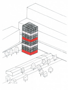 Un cohabitat vient s’implanter près de cette respiration et possède une empreinte au sol relativement faible. L’idée est de se développer verticalement pour libérer l’espace au sol. Cela est rendu possible, car le projet est en accord avec les hauteurs des bâtiments l’entourant. Les bâtiments aux alentours ne sont pas des logements, mais des bureaux.