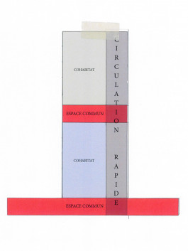 Dans la tour de logement, une attention particulière est portée à la circulation et au chemin que prend chaque personne se rendre dans son logement. Le bâtiment possède 2 cohabitats superposés. Chaque cohabitat possède en son centre un espace commun important. L’idée est d’inciter les gens à prendre l’ascenseur pour rejoindre cet espace. De là, une circulation plus douce permet de monter ou de descendre pour atteindre son logement. Il est clair que personne ne monte 5, 7 ou 10 étages à pied, mais ce principe permet de ramener la rencontre et l’échange au sein de la tour.