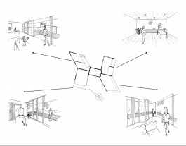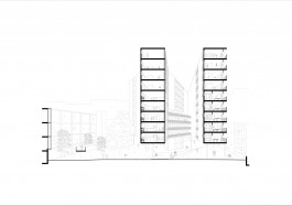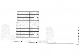 Le choix de la typologie de la tour permet une empreinte au sol réduite tout en amenant un densité de logements. Aussi, en s’implantant sur le bosquet à coté du bâtiment O, la tour profite des vues dégagées dues au square de l’Avenue Adolphe Buyl et son intersection avec l’Avenue Paul Héger. Le projet vient alors créer un nouveau lien entre la ville et l’université. Ensuite, le terrain est travaillé pour adoucir sa pente et des « cellules » d’équipements publics sont installées en suivant les courbes topographiques. L’ensemble du parc est traversée par une rampe. Il y a également des « cellules » privées communes aux habitants (circulations verticales, garage à vélo, …). La tour est composée de 4 ailes rassemblées autour de la cage d’escaliers qui offre différents espaces partagés. De plus, ces ailes diffèrent par leur orientations, les espaces extérieurs qu’elles proposent et aussi par les logements qui les composent.