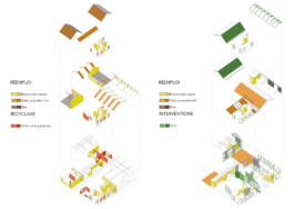 Enfin, notre intervention se traduit par un geste d’acupuncture architecturale, utilisant les matériaux réemployés issus des démontages sélectifs pour créer des îlots activateurs dans les différentes halles, servant d’espace d’accueil et renforçant l’accessibilité du site.