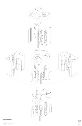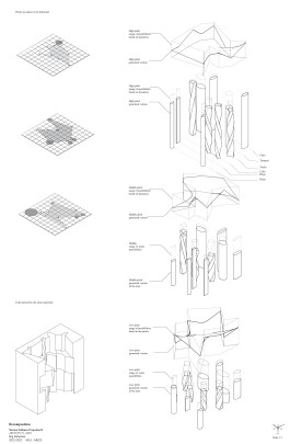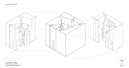 Ce projet a été réalisé dans le cadre du cours « Analyse formelle et processus informatique » (Enseignants: Denis Derycke (coord.), Michel Lefèvre, Julien Rippinger). Le travail proposé aux étudiants consiste à explorer un système de composition autonome en se basant sur l’analyse d’une œuvre d’art – dans ce cas-ci une pièce musicale. Les étudiants transcrivent leur interprétation de l’œuvre choisie dans le langage de programmation Python, et génèrent des configurations spatiales paramétriques pour investir l’espace d’un cube de 10 cm de côté. Ces processus analytiques et génératifs s’opèrent exclusivement dans un espace graphique axonométrique et utilisent à des fins exploratoires l’impression 3D par extrusion de plastique ou par solidification de résine.