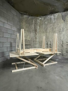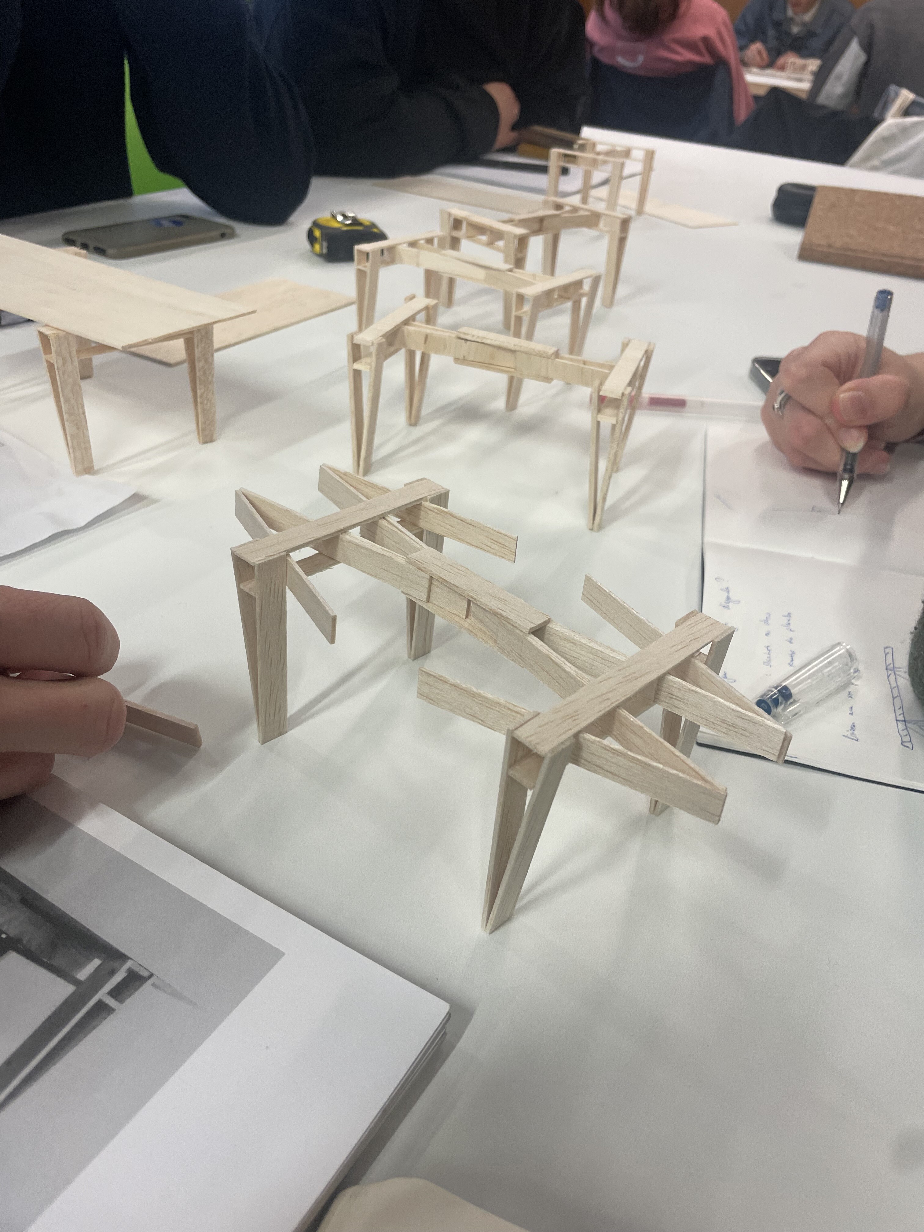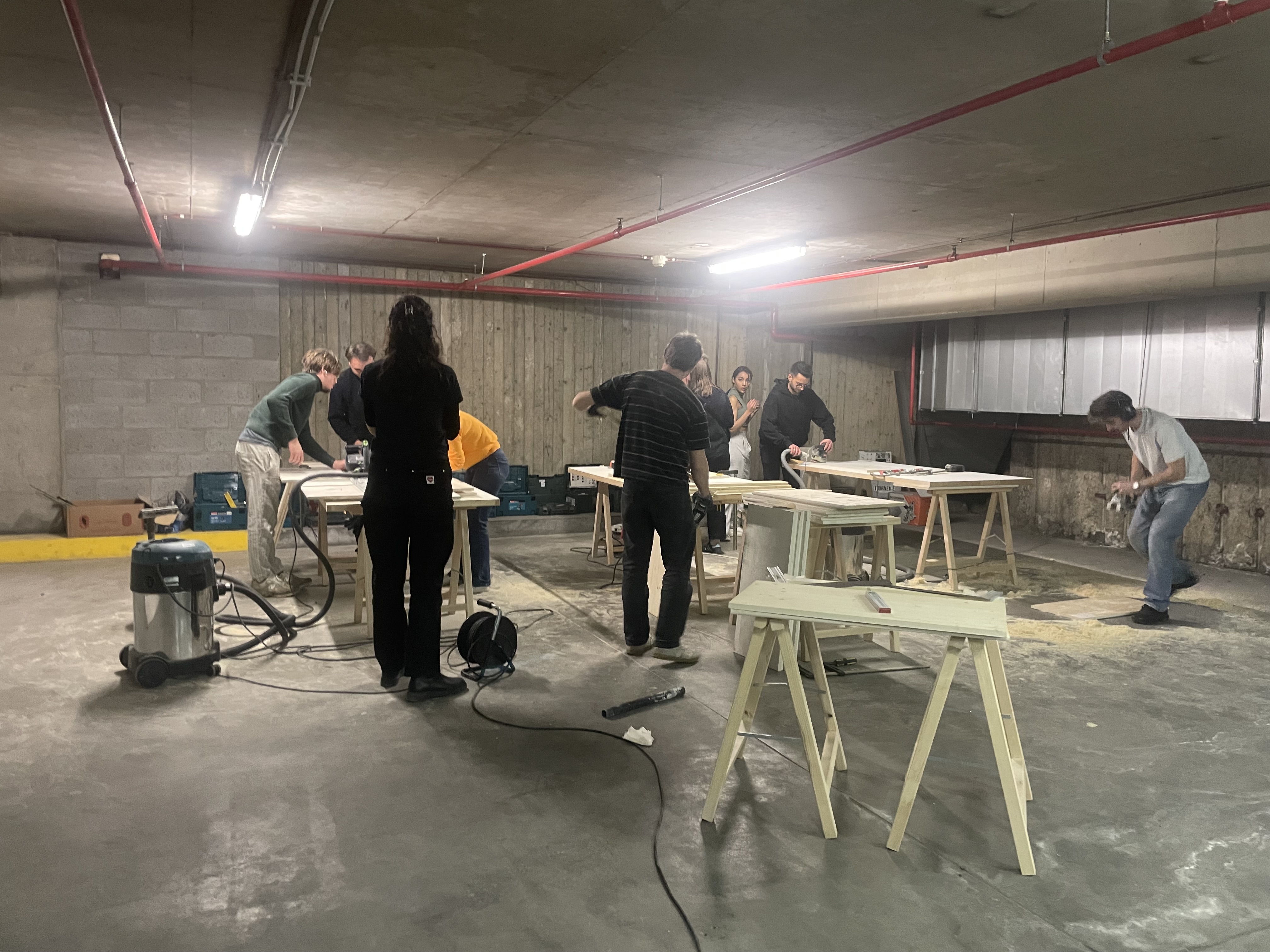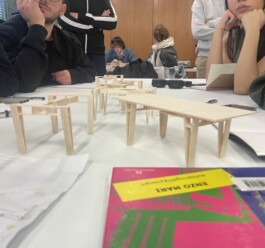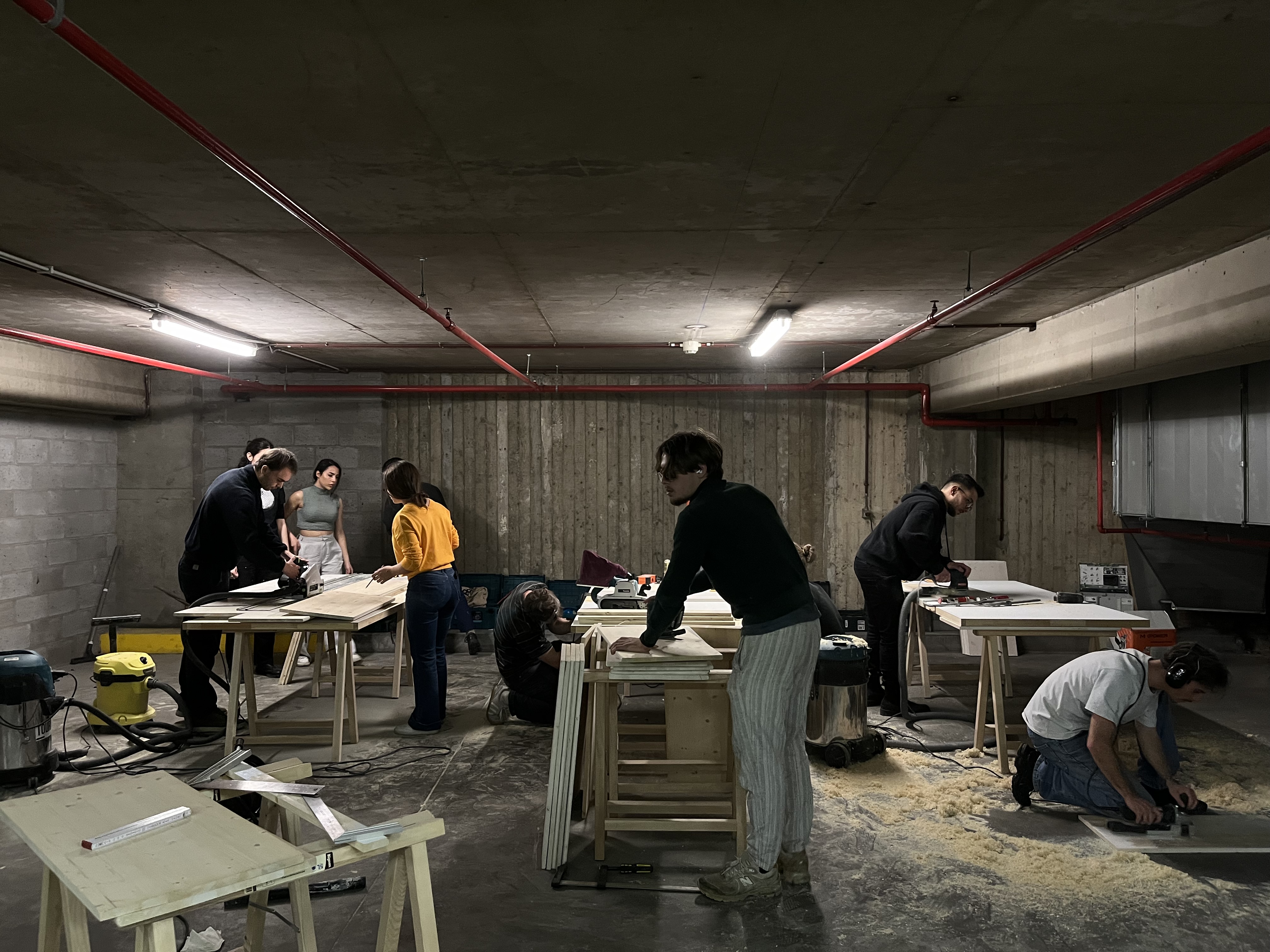 Nous avons proposé à une trentaine d'étudiant·es d'explorer ces plans et l'univers d'Enzo Mari lors d'une semaine consacrée à la conception et à la fabrication de meubles. La conférence introductive de Cristina Bargna (manager de la collection du Design Museum de Bruxelles) et le support technique de Emmanuel Bérard de l'atelier "Chantiers Battus" ont inspiré les étudiant·es à concevoir six tables et deux chaises en utilisant des matériaux de récupération. En s'approvisionnant chez Rotor Deconstruction pour les planches de bois et chez In Limbo pour les panneaux en plastique recyclé de Bel Albatros, ces meubles ont offert une occasion de confronter le design à la réalité géométrique particulière des matériaux de réemploi.