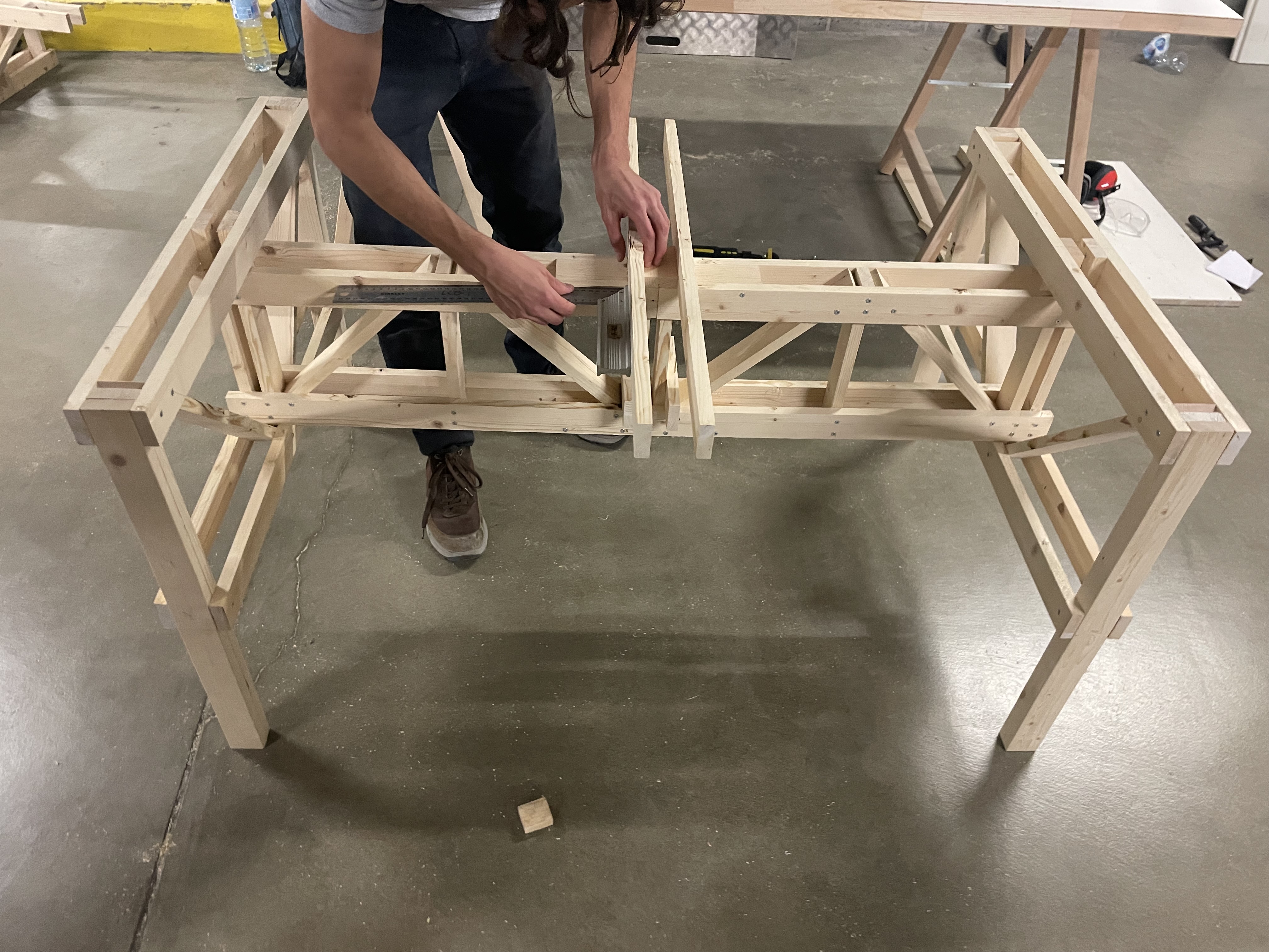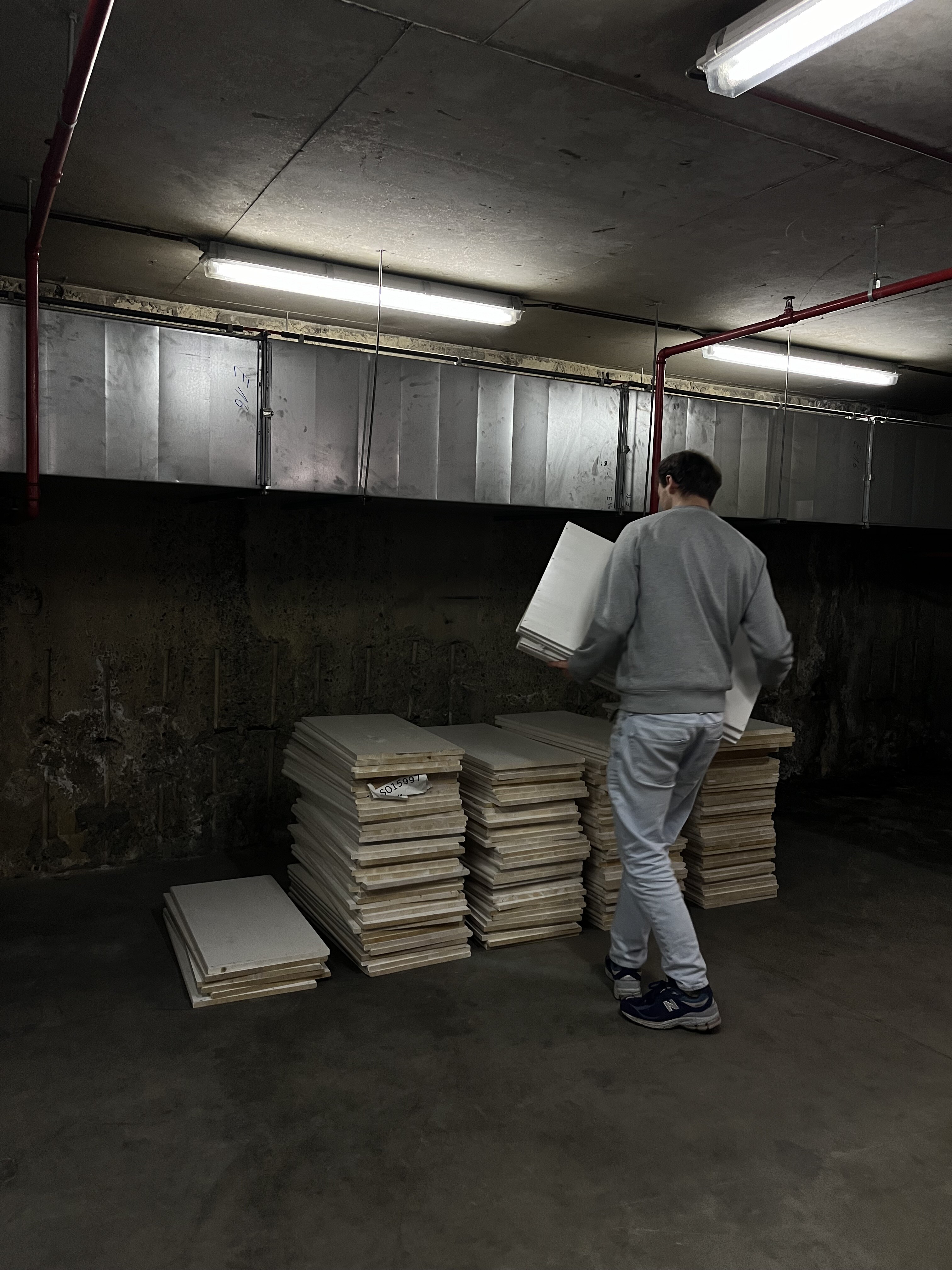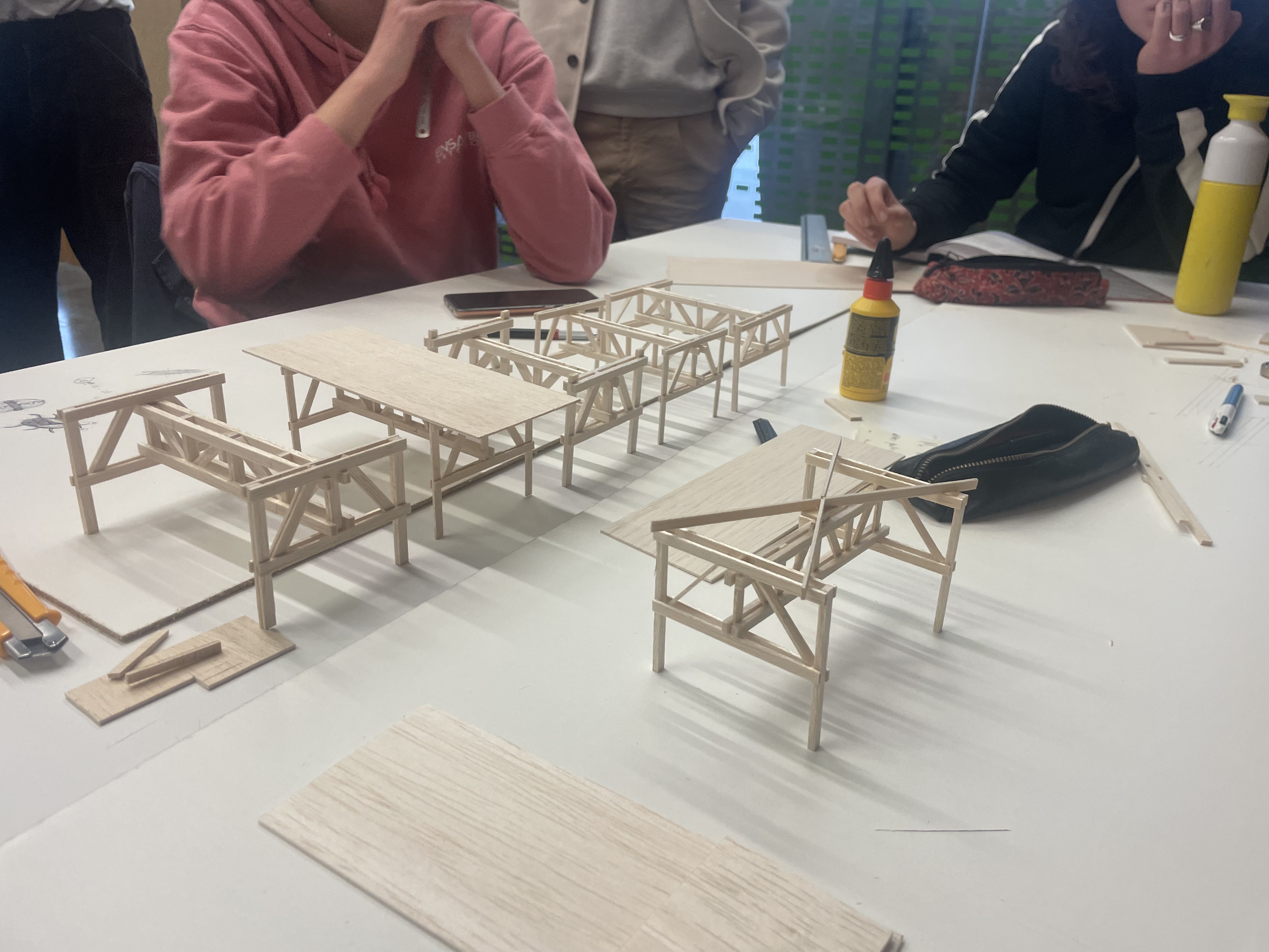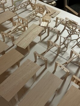 Nous avons proposé à une trentaine d'étudiant·es d'explorer ces plans et l'univers d'Enzo Mari lors d'une semaine consacrée à la conception et à la fabrication de meubles. La conférence introductive de Cristina Bargna (manager de la collection du Design Museum de Bruxelles) et le support technique de Emmanuel Bérard de l'atelier "Chantiers Battus" ont inspiré les étudiant·es à concevoir six tables et deux chaises en utilisant des matériaux de récupération. En s'approvisionnant chez Rotor Deconstruction pour les planches de bois et chez In Limbo pour les panneaux en plastique recyclé de Bel Albatros, ces meubles ont offert une occasion de confronter le design à la réalité géométrique particulière des matériaux de réemploi.