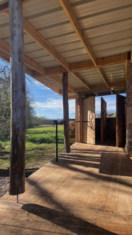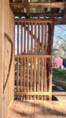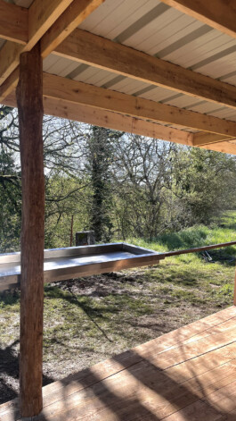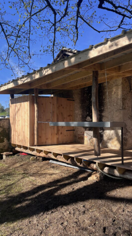 La commande de La Maison Forte consistait à construire un cabanon sanitaire avec deux douches, une toilette sèche PMR, et un point d’eau. Les étudiant·es ont eu libre cours pour co-concevoir le projet jusqu'aux aux détails de mise en œuvre (jonction fondation/murs/toiture, ouverture,…), avec des matériaux déjà sélectionnés et des techniques constructives écologiques choisies. Après cette brève phase de conception, place au chantier : des fondations, à la toiture en passant par les bases d’une installation électrique. Ce petit cabanon a permis d'explorer toutes les bases d’un bâtiment écologique, sans trop de contraintes, et surtout de passer de la conception à la réalisation et de se rendre compte des aléas des chantiers. Le tout dans un cadre d’échange de compétences et de bonne humeur.