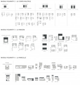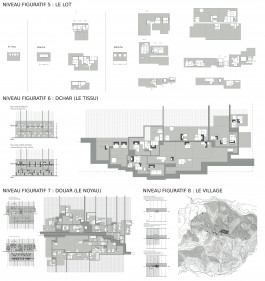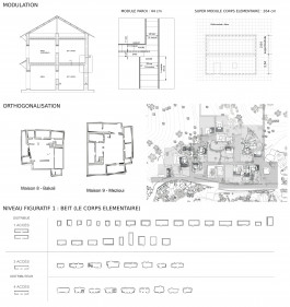L'analyse formelle du village fonctionne par niveaux logiques de figures. Précédée par un travail de relevé et de retranscription, elle propose 8 niveaux de configurations allant du corps élémentaire en tant qu'unité la plus indivisible jusqu'à la configuration du village entier. Inscrite dans la théorie des ensembles de Wittgenstein et dans la théorie des genres (generati) d'Alberti, cette analyse des figures considère ce village comme une oeuvre collective d'architecture et ne sépare pas ce qui relève de la paroi (Niveaux 1 à 3) de ce qui relève de la parcelle (Niveaux 4 à 8).