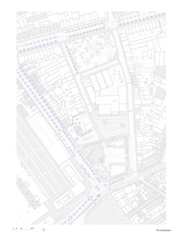 Le projet souhaite profiter de cette situation en développant une barrière naturelle avec les axes routiers afin de créer un lieu protégé des nuisances et connecté au reste de la ville. Un travail des voiries est proposé pour ralentir et végétaliser la circulation automobile tout en offrant plus d’espace aux piétons et cyclistes. Deux pavillons, une guinguette et un club de pétanque, animeront les extrémités du site. La réorganisation des espaces offrira un accès piétonnier privilégié, tandis qu'un nouveau parvis marquera l'entrée de la maison communale.