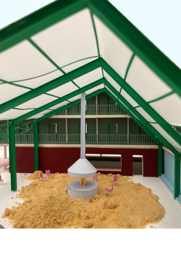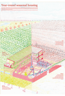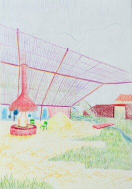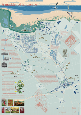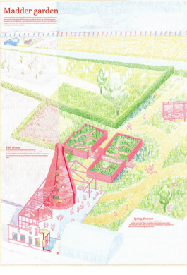 Nieuwvliet est un village en bord de mer aux Pays-Bas, qui est devenu une destination de choix pour les vacanciers, avec une grande partie de son territoire dédiée à des campings et autres infrastructures. Cependant, cette affluence touristique crée une fracture nette entre la zone balnéaire animée et le village historique, qui sont séparés non seulement par la distance, mais aussi par leur fonction et leur ambiance. Cette division met en lumière plusieurs problèmes : la polarité croissante entre le vieux village et les campings, les conditions de vie difficiles pour les travailleurs saisonniers, tant dans le secteur du tourisme que dans l’agriculture, ainsi que le manque d’offres culturelles et l’absence d’un lieu de rencontre pour les habitants. Pour répondre à ces enjeux, nous nous sommes tournées vers l’histoire de la région et avons découvert que la culture de la « garance des teinturiers » (rubia tinctorum en latin, madder en anglais), autrefois répandue en Zélande pour ses pigments rouges, roses et jaunes, était lucrative et florissante, et pouvait être réintroduite comme alternative aux pigments synthétiques. Nous avons décidé d’intervenir en créant un lien physique et symbolique entre les deux parties du village : un ancien hangar de ferme, situé à mi-chemin entre les campings et le village, est transformé en logement pour les travailleurs saisonniers, et un champ adjacent a été planté avec de la rubia tinctorum. Dans le village, nous avons réaménagé une parcelle abandonnée sur la rue principale pour en faire un jardin public et une salle polyvalente au caractère intime. Cet espace inclut le four pour sécher les racines de la rubia tinctorum, nécessaire à l’extraction des pigments. Ce lieu polyvalent peut être utilisé aussi bien en été qu’en hiver, offrant aux habitants un endroit où se rassembler, se réchauffer et échanger. En réintroduisant cette culture ancienne et en créant ces nouveaux espaces, nous espérons renforcer les liens communautaires et rétablir un équilibre entre les différentes facettes de Nieuwvliet.